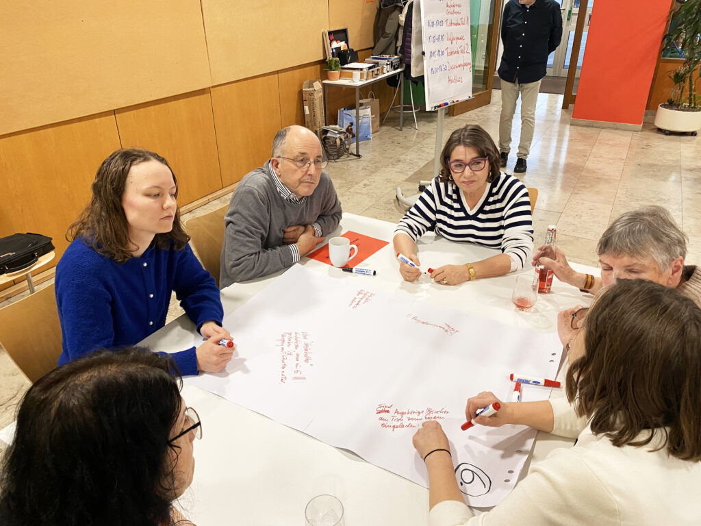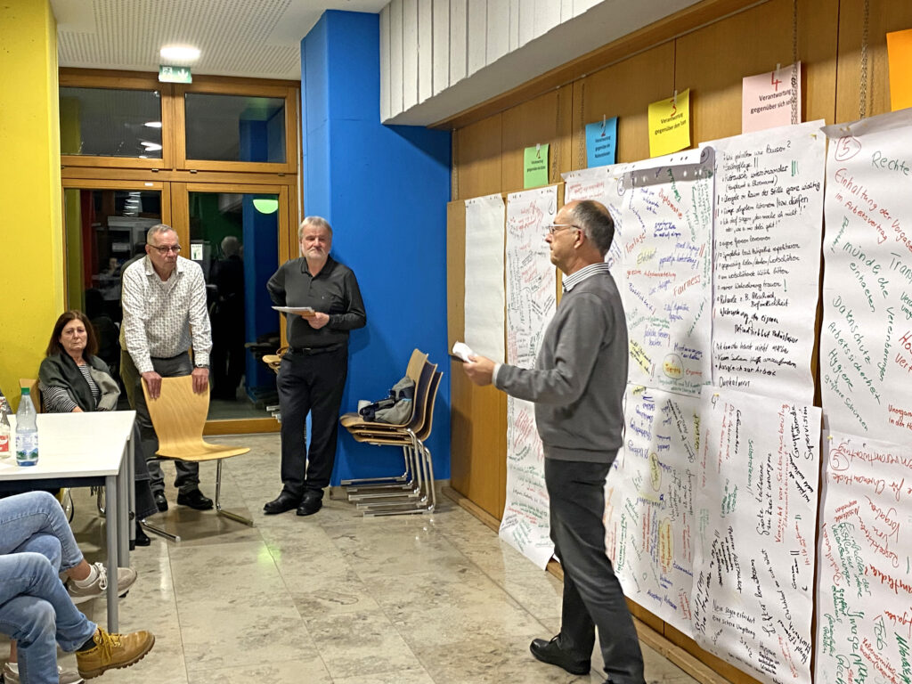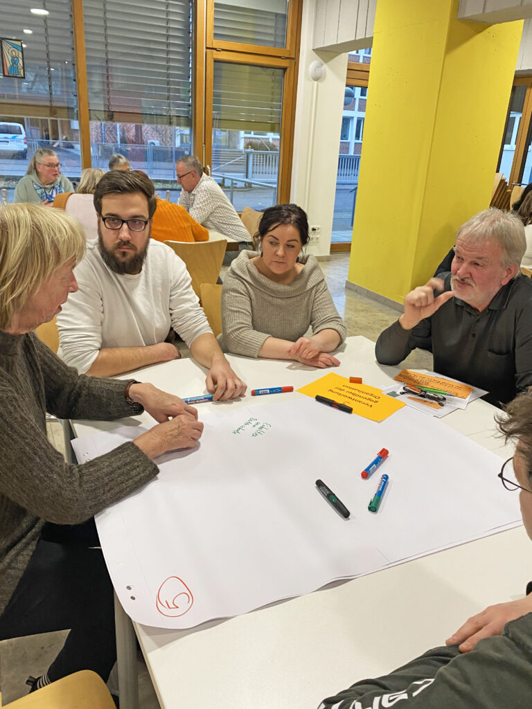 Mit der Methode „World-Café“ wurden wir Mitarbeitende an sechs Tischen eingeladen, uns zu unserer Verantwortung gegenüber Gästen, Einrichtung, Team, uns selbst usw. Gedanken zu machen. Das Besondere daran war, dass es nicht ums Diskutieren oder Werten ging, sondern dass gewünscht war, dass „alles gesagt wird“ und so ein ungemeiner Reichtum an vielfältigen Wahrnehmungen und Sichtweisen zutage kam. Die Station „Was ich schon immer mal sagen wollte…“ lud ein, auch bisher nicht Benanntes ins Wort zu bringen. Jede Kleingruppe aus 4-5 Personen wechselte nach 15 Minuten die Tische, sodass jeder alle Themen bearbeiten konnte. Wir erlebten eine ungemein reiche und wertschätzende Atmosphäre miteinander, bei der die Zeit wie im Flug verging. Das Zusammentragen der Inhalte gegen Ende machte deutlich, wie engagiert alle dabei waren. Nun liegt viel verantwortungsvolle Arbeit bei denen, die mit den Ergebnissen weiterarbeiten, damit Inhalte gebündelt und in die Praxis umgesetzt werden können. Wir waren uns einig, wie wertvoll so ein Nachmittag ist. Danke dafür! Uns allen viel Mut, Geduld und Veränderungsbereitschaft beim Umsetzen in den Alltag!